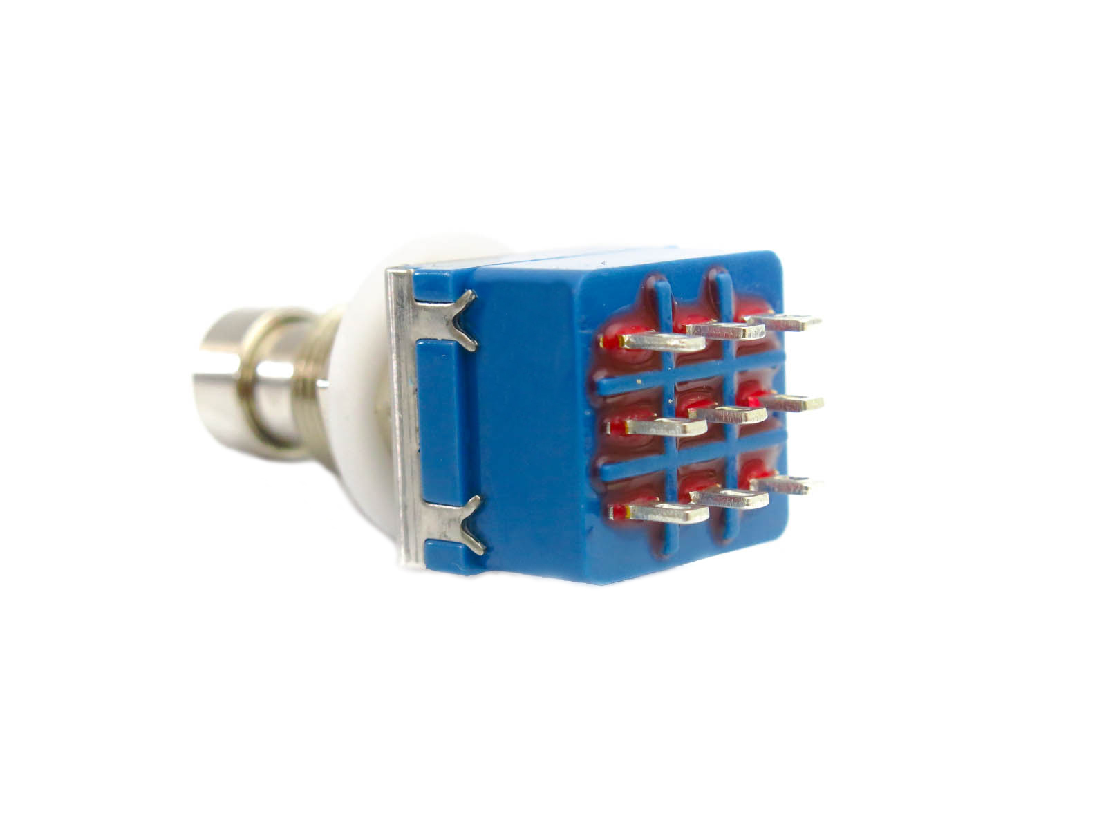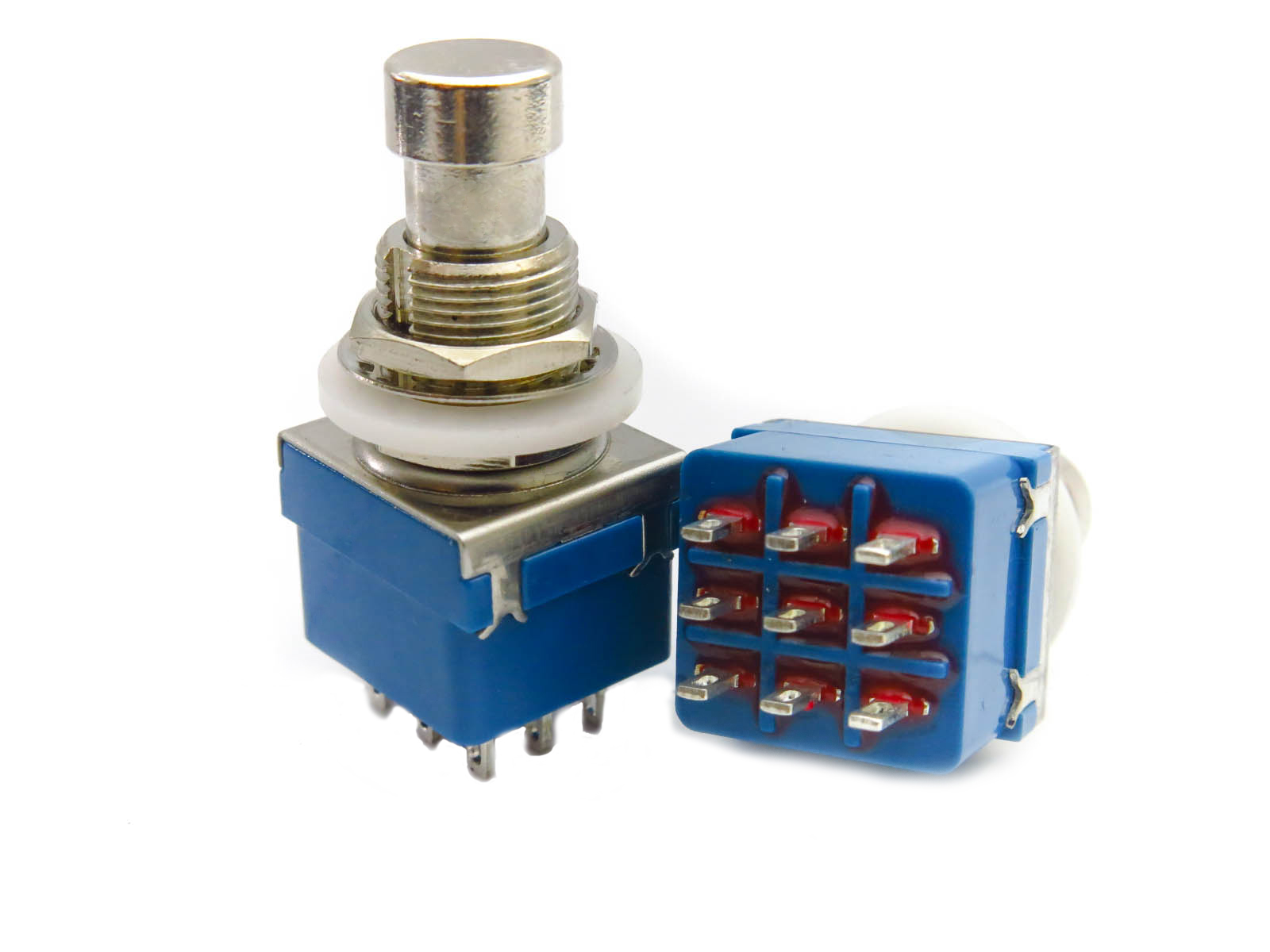 This is a 3PDT Latching Solder Lug Footswitch Blue, True Bypass and infamously made in Taiwan.